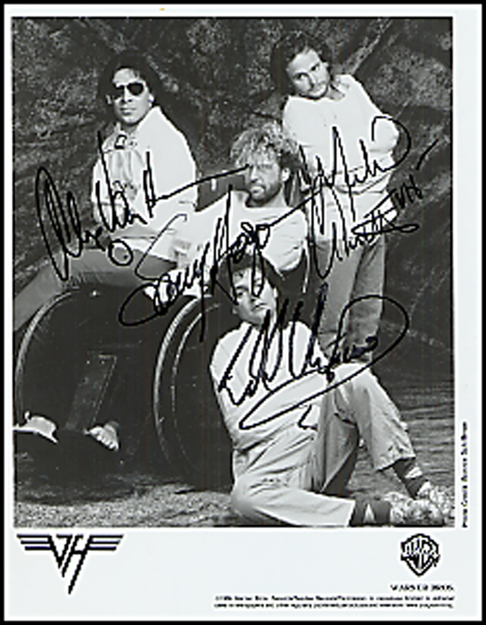 Glossy 8 x 10 Warner Bros. promotional photo circa 5150, signed in black felt tip by all four members: Michael Anthony, Sammy Hagar, Eddie Van Halen and Alex Van Halen. In fine condition, with a few light creases. COA Roger Epperson and RRAuction COA.