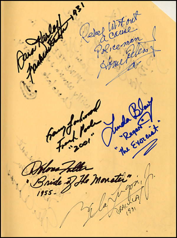 Signed book: The Chronicle Of The Movies. NY: Crescent Books. Hardcover with dustjacket, 9 x 12, 448 pages. Signed on the opening and closing pages in ink or felt tip by Shirley Eaton, Anne Francis, Maureen Stapleton, Hugh O'Brien, Diana Sowle, Sara Karloff, Bela Lugosi, Jr., Gary Lockwood, Karolyn Grimes, Veronica Cartwright, Homer Peters, Jr., Linda Blair, Dolores Fuller, Betty Palmer, Angela Cartwright, Jane Withers, Lauren Hutton, Leonard Maltin, Edie Adams, Wm. Windom, Paul Picerni (2), Joe Brooks and two others. Several signatures are on affixed slips. In fine condition, with scattered light wear to dustjacket. RRAuction COA.