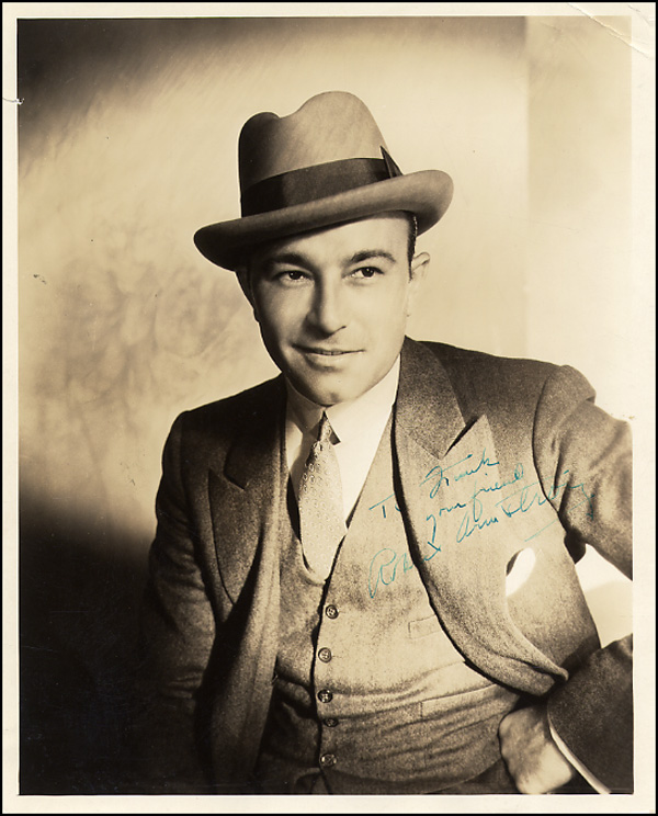 Character actor who got one of the most famous exit lines in movie history, uttered in King Kong, by his character, adventurous filmmaker Carl Denham, "It was beauty killed the beast." Vintage sepia 8 x 10 photo, signed and inscribed in fountain pen 'To Frank, Your friend, Robert Armstrong.' A few creases and some minor adhesion trouble to portion on inscription, otherwise fine condition. Frank Healy worked in the movie industry for almost 40 years, primarily at RKO Studios where he was Chief Stage Hand for most of that time. RRAuction COA.