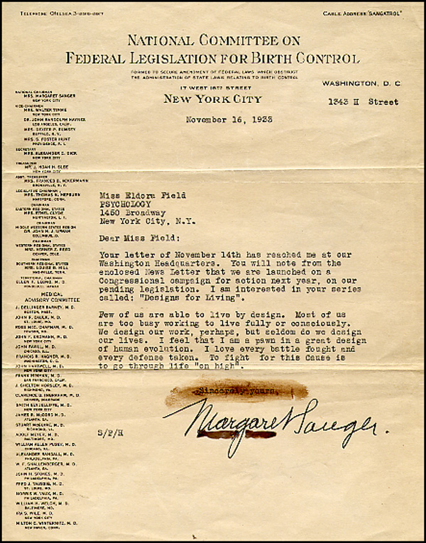 Founder of the American birth control movement and, later, the Planned Parenthood Federation of America. TLS, one page, 8.5 x 11, National Committee Of Federal Legislation For Birth Control letterhead, November 16, 1933. Letter to Psychology Magazine, answering the question of 'What is your design for life?' In part, 'Few of us are able to live by design. Most of us are too busy working to live fully or consciously. We design our work, perhaps, but seldom do we design out lives. I feel that I am a pawn in a great design of human evolution. I love every battle fought and defense taken.' Light overall toning, several stray ink marks, one obscuring closing and the other under signature and a few creases, otherwise fine condition. RRAuction COA.
