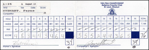 US Open and Ryder Cup champion killed in a mysterious plane crash. Stewart's official scorecard from the first round of the 1992 PGA Championship at Bellerive Country Club, measures 5.5 x 4 closed and opens to an 11 x 4 scorecard for all eighteen holes. Signed at the bottom in pencil by Stewart, who shot a 76. Also signed by his marker, Hale Irwin. In fine condition, with a vertical crease to both sides. RRAuction COA.