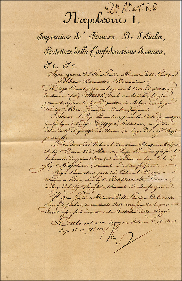 DS, signed 'Nap,' one page, 8 x 12.5, no date. Document number 606, in untranslated Italian, boldly signed at the conclusion by Napoleon. In fine condition, with even light toning and expected folds. COA John Reznikoff/University Archives and RRAuction COA.