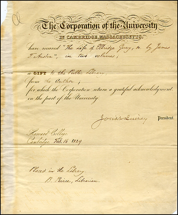 DS, one page, 8 x 10, The Corporation Of The University letterhead, February 16, 1829. Quincy acknowledges the Harvard Library receiving a copy of The Life of Elridge Gerry, from its author James Austin. In fine condition, with rough left edge and scattered light toning. RRAuction COA.