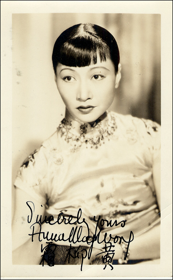 Attractive vintage matte-finish 3.5 x 5.5 photo, signed in fountain pen, 'Sincerely yours, Anna May Wong,' adding Chinese characters underneath. In fine condition, with a couple light creases to lower right corner, slightly affecting end of last name. RRAuction COA.
