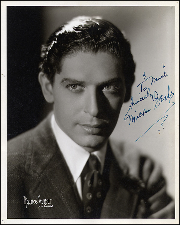 Handsome vintage matte-finish 8 x 10 photo, signed and inscribed in fountain pen 'To 'Mush' Sincerely, Milton Berle.' Collector's notation on reverse notes signature was obtained backstage at Loew's in 1936. In fine condition, with a minor brush to signature. RRAuction COA.