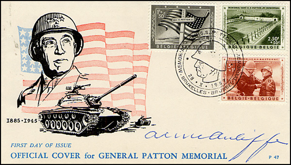 WW II Brigadier General in command of the 101st Airborne division. Made the famous reply 'Nuts!' to the surrender ultimatum of surrounding German force. Commemorative cover, 6.5 x 3.75, issued by Belgium with a cachet honoring George Patton, signed in blue ballpoint by McAuliffe. In fine condition. RRAuction COA.
