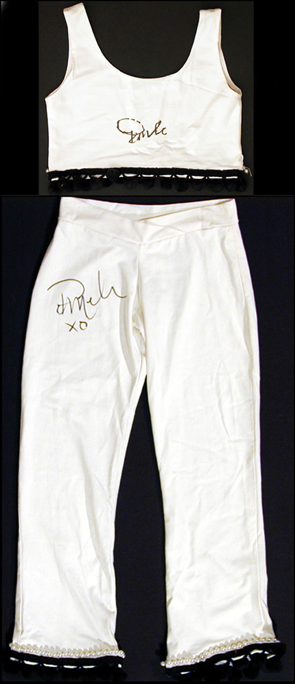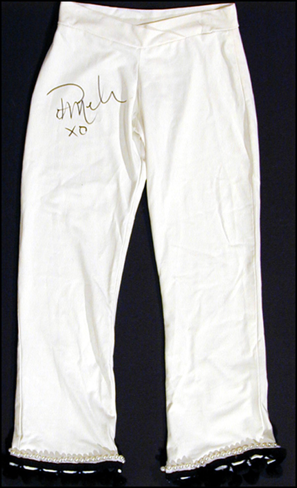 Pamela Anderson's screen worn pants and top from VIP. Custom made off-white stretch pants are highlighted at the cuffs by row of faux pearl and black dingle balls, as is the matching halter top. This outfit was worn in Season three, episode seven entitled Magnificent Val. Signed on the front of the pants in black felt tip and on the top in gold ink by Anderson. In fine condition. Accompanied by a Certificate of Authenticity from Gerry Anderson (Pam's brother), also signed by Pam. RRAuction COA.