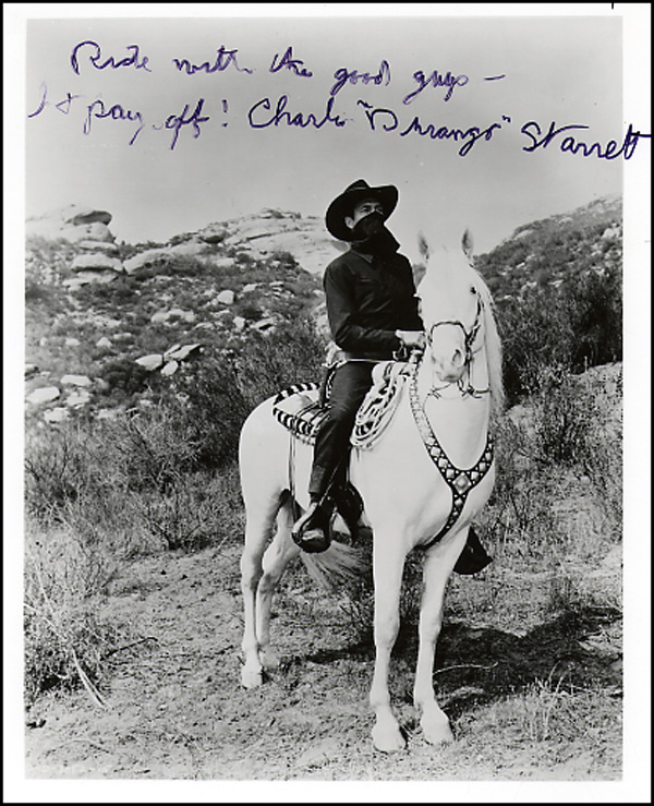 Glossy 8 x 10 photo of Starrett on horseback, signed in black felt tip, 'Ride with the good guys. It pays off! Charles 'Durango' Starrett.' In fine condition. RRAuction COA.