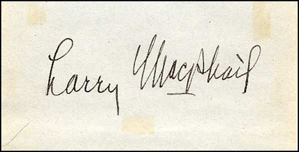 Fountain pen signature, 'Larry MacPhail,' on a light blue 4.5 x 2.5 album page. In fine condition, with a few light small blocks of toning, not affecting signature. COA Mike Gutierrez/Global and RRAuction COA.