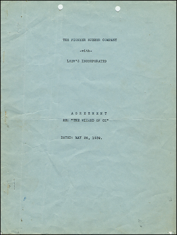 DS, eleven pages, 8.5 x 11, May 26, 1939. Licensing agreement between Loew's Incorporated and the Pioneer Rubber Company for the distribution of balloons bearing the characters from the movie. Loew's will receive between three and five percent for each balloon sold. Signed on the last page by the vice President of Pioneer. In fine condition, with expected punch and staple holes. RRAuction COA.