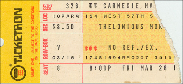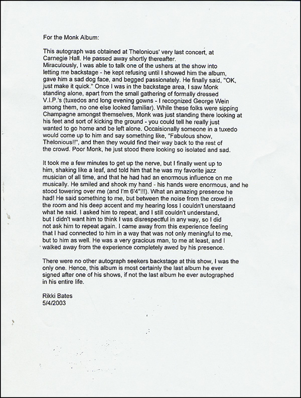 Thelonious Monk album signed backstage after his last concert at Carnegie Hall