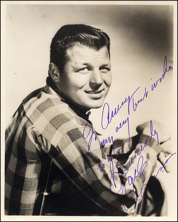 Vintage matte-finish 8 x 10 photo, signed and inscribed in purple fountain pen 'To Anney, My very best wishes to you, Sincerely, Jack Carson.' In fine condition. RRAuction COA.