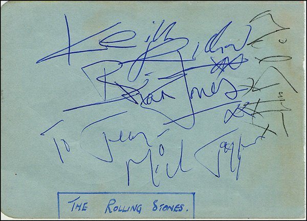 Vintage signatures of all five Rolling Stones. A 5 x 3.5 light blue album page, signed by Keith Richards, Brian Jones and Mick Jagger, who has signed twice and inscribed once to Jeen; ballpoint signature of Bill Wyman on a 3 x 2.75 off-white slip and a ballpoint signature of Charlie Watts on a 3.5 x 3 off-white album page. In very good condition, with some light bends and toning, some minor overlapping to Richards, Jones and one Jagger signature and a small collectors notation. RRAuction COA.