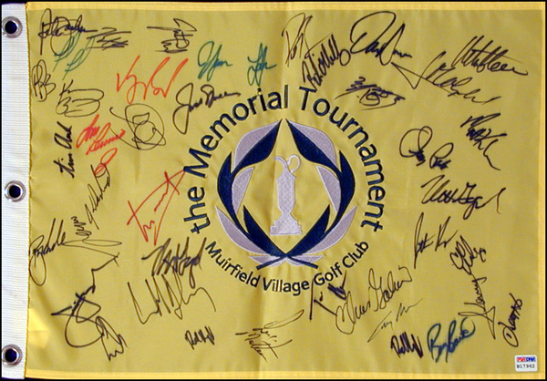 2003 Memorial Tournament golf flag, 19.5 x 13.5, signed in felt tip on the front by forty participants of the event including: Sergio Garcia, Jack Nicklaus, Jim Furyk, Kenny Perry (2003 winner), Jose Maria Olazabel, Len Mattise, Lee Janzen, Justin Leonard, Retief Goosen, Ernie Els and Charlie Howell. In fine condition, with a PSA/DNA identification label affixed to lower right corner. RRAuction COA.
