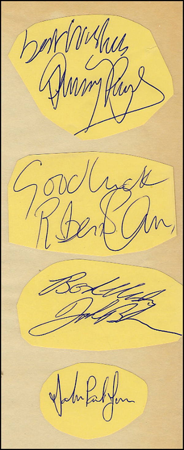 Ballpoint signatures, 'Best wishes, Jimmy Page,' 'Good luck, Robert Plant,' 'Best wishes, John Bonham' and 'John Paul Jones,' on separate clipped yellow album pages, all affixed to a 4 x 9 sheet and laminated. In fine condition. COA Roger Epperson and RRAuction COA.