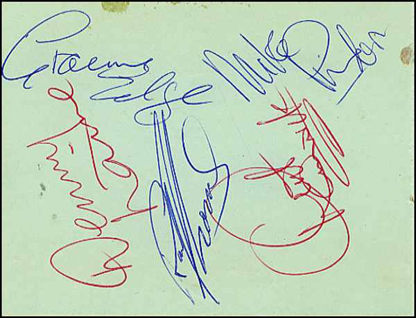 Ballpoint signatures of all five original members, Mike Pinder, Denny Laine, Ray Thomas, Graeme Edge and Clint Harwick, on a light green 3.5 x 4.5 album page. In fine condition, with some light edge soiling and some slight overlapping to a couple signatures. COA Roger Epperson and RRAuction COA.
