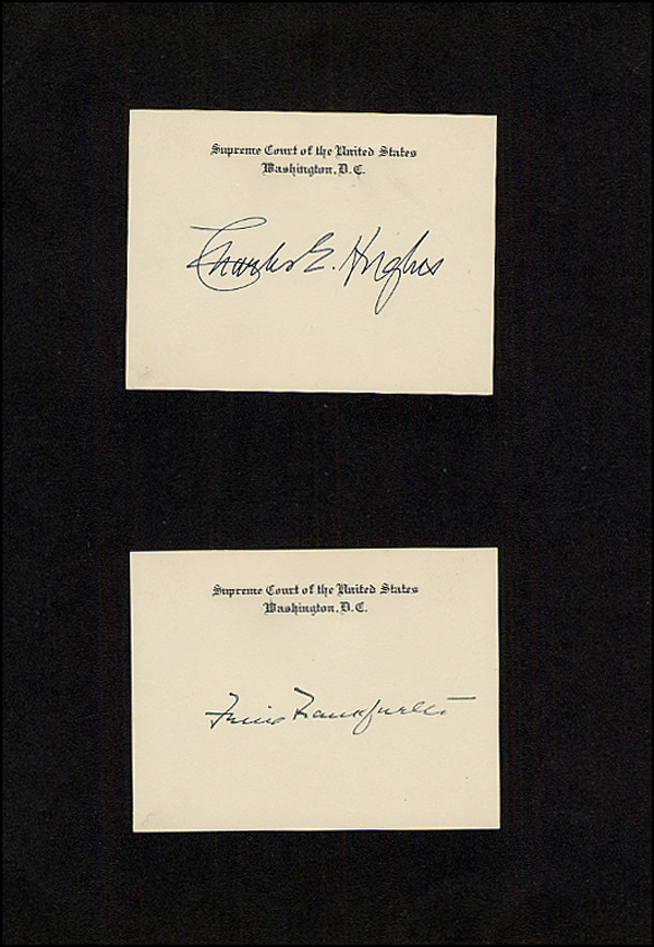 Lot of nine 4.25 x 3.25 Supreme Court cards, each individually signed by a different Justice. Signors are: Pierce Butler, Harlan Stone, J. C. McReynolds, Hugo L. Black, Charles E. Hughes, Felix Frankfurter, Owen Roberts, Stanley Reed and Louis Brandeis. In fine condition, with all cards affixed to two black 8.5 x 11 sheets. RRAuction COA.
