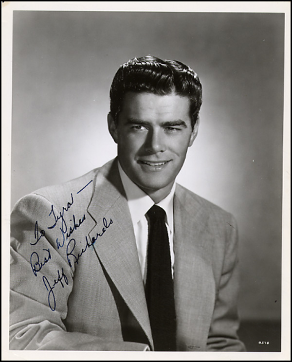 Vintage glossy 8 x 10 photo, signed and inscribed in black ink 'To Tyra, Best wishes, Jeff Richards.' In fine condition, with some scattered light surface marks and impressions. RRAuction COA.
