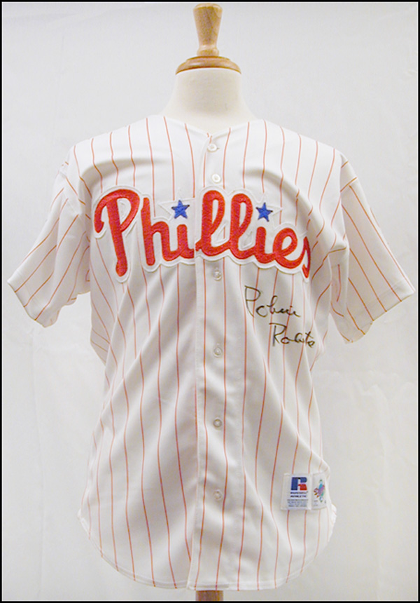 Official Rawlings replica Philadelphia Phillies baseball jersey, with sewn on letters and numbers, signed in felt tip on the front. In fine condition, with some light haloing to signature. RRAuction COA.
