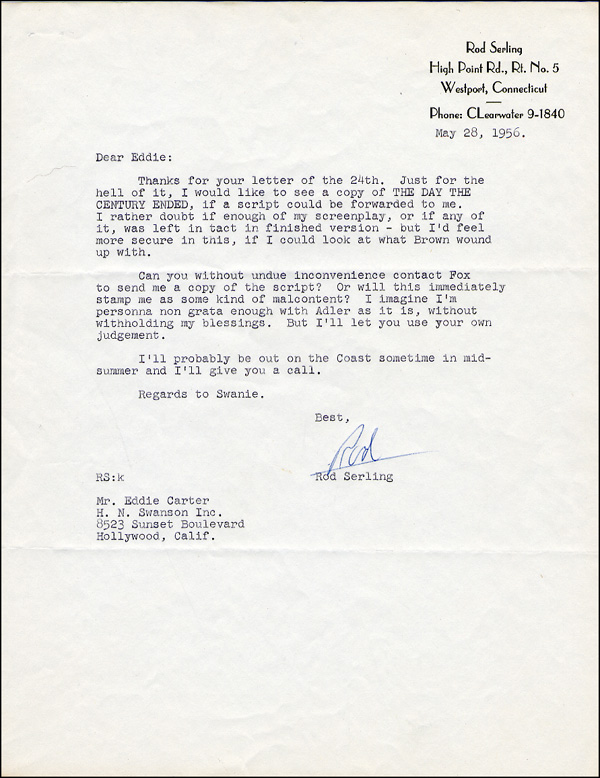 TLS signed 'Rod,' one page, 8.5 x 11, personal letterhead, May 28, 1956. Letter to his agent regarding a screenplay. In part, 'Just for the hell of it, I would like to see a copy of The Day the Century Ended, if a script could be forwarded to me. I rather doubt if enough of my screenplay, or if any of it, was left intact in the finished version - but I'd feel more secure with this...Can you...contact Fox to send me a copy of this script? Or will this immediately stamp me as a malcontent? I imagine I am persona non grata enough with Alder as it is....' In fine condition. RRAuction COA.