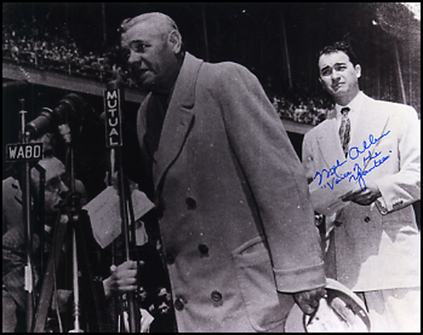 Glossy 10 x 8 photo of Babe Ruth's farewell speech, signed in blue felt tip, 'Mel Allen 'Voice of the Yankees.'' In fine condition. RRAuction COA.