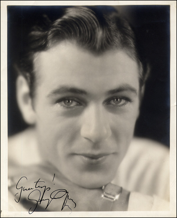Vintage matte-finish 8 x 10 photo of Cooper resting his chin on his hand, signed in fountain pen, 'Greetings, Gary Cooper.' In fine condition, with a bit of scattered light silvering to edges and some light edge wear. RRAuction COA.