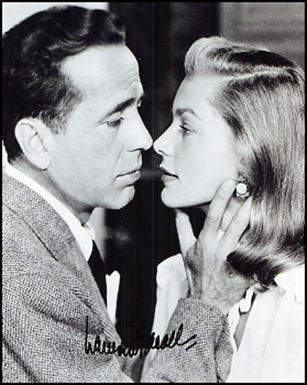 Glossy 8 x 10 photo of Bacall staring intently into the eyes of Humphrey Bogart, signed in black felt tip by Bacall. In fine condition. RRAuction COA.