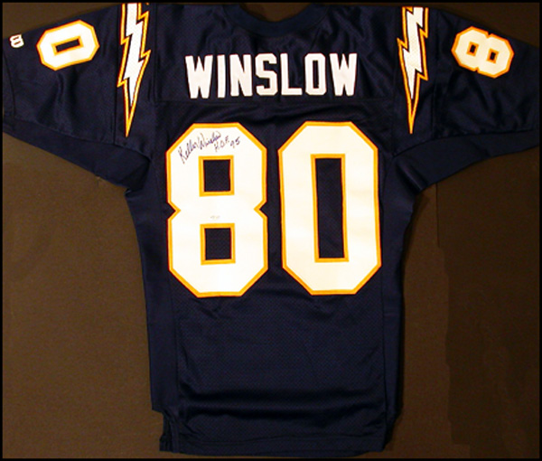 Official Wilson replica San Diego Chargers football jersey, with sewn on letters and numbers, signed in felt tip on the number on the back, 'Kellen Winslow H. O. F. 95.' In fine condition, with a small removable collector's label to middle of number. RRAuction COA.