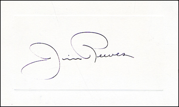 Country-pop star who enjoyed international fame until his death in 1964. Ink signature, 'Jim Reeves,' on a white double weight 5.75 x 3.5 custom-made collector's card (similar in look to an invitation card) . In fine condition. RRAuction COA.