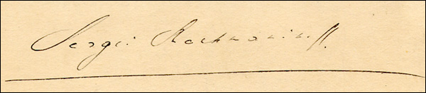Russian composer, pianist and conductor. Uncommon full fountain pen signature, 'Sergei Rachmaninoff,' on an off-white 4.75 x 1.5 slip. In fine condition. RRAuction COA.
