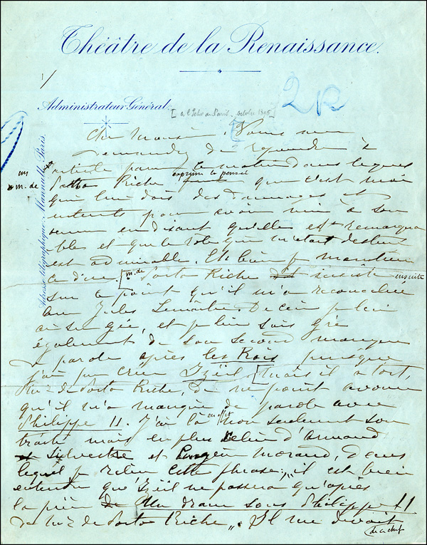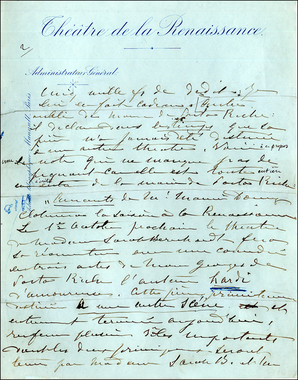 Known as 'The Divine Sarah,' world-renowned French actress was one of the greatest actresses of the 19th Century. ALS, in French, three pages, 8.25 x 10.5, Theatre de la Renaissance letterhead, October 1895. Letter trying to clear up a legal dispute. In part, 'You ask me to reply to the article for this morning's edition in which Porto-Riche expresses the thought that it is I who owe him damages plus interest for having done harm to his work by saying it is remarkable and that the role which was destined for one was admirable. Well, I still hold to this view...But Mr. Porto-Riche is wrong not to admit that he broke his promise to me with Philip II.I have here, not only his written agreement...from which I quote 'It is well understood that Iseil will not be performed until after the play, Un Drame sous Philip II, by Porto-Riche.' He owed me 5,000 francs as a penalty for braking his contract with me, I offer them to him as a gift. Another lapse of memory my M. Porto-Riche...you see, dear sir, that M. P. R.'s memory is much more faulty than mine. In fact, to top off his cruelty, he has (tried) to have his charming statement printed full-blown on the day of my opening in Lycestrata in order to punish the theatre for having withdrawn Amoureuses from the billboards.' Some scattered light toning, several stray ink marks and notations and a bit of soiling, otherwise fine condition. RRAuction COA.
