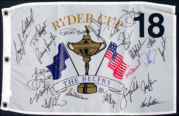 Nice 2001 (2) Ryder Cup golf flag from The Belfry, 21 x 14, signed in person in felt tip on the front by Team USA members Tiger Woods, David Toms, Jim Furyk, David Duval, Phil Mickelson, Paul Azinger, Davis Love, Stuart Cink, Mark Calcavecchia, Scott Verplank, Jeff Sluman and Hall Sutton and by European members Lee Westwood, Thomas Bjorn, Sergio Garcia, Bernhard Langer, Padraig Harrington, Jesper Parnavik, Colin Montgomerie and Darren Clark. Also signed by team captains Sam Torrance and Curtis Strange. this cup match was originally to be played in 2001, but due to the events of 9/11, was postponed for one year. In fine condition. RRAuction COA.