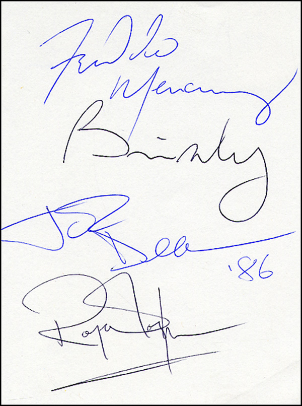 Ballpoint signatures of Freddie Mercury, Brian May, Roger Taylor, and John Deacon adding (''86'), on an off-white 4.5 x 6 slip. In fine condition. Perfect for matting. RRAuction COA.
