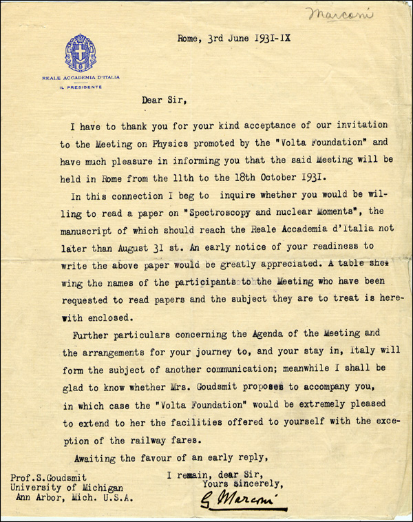 Italian physicist and inventor who devoted his life to experiments in wireless communication, and was awarded with the Nobel prize in 1909. TLS signed 'G. Marconi,' one page, 8 x 10, Reale Accademia d'Italia letterhead, June 3, 1931. Letter to physicist Samuel Goudsmit. In part, 'I have to thank you for your kind acceptance of our invitation to the Meeting of Physics promoted by the 'Volta Foundation' and have much pleasure in informing you that the said Meeting will be held in Rome...In this connection I beg to inquire whether you would be willing to read a paper on Spectroscopy and Nuclear Moments...An early notice of your readiness to write the above paper would be greatly appreciated...Further particulars concerning the agenda of the Meeting...will form the subject of another communication. I shall be glad to know whether Mrs. Goudsmit proposes to accompany you.' In fine condition, with a few light bends and creases, mostly to right edge, pencil notation to top and a couple staple holes to top left corner. COA John Reznikoff/University Archives and RRAuction COA.