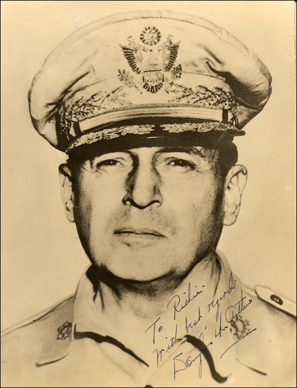 Vintage 7 x 9.25 head and shoulders photo of MacArthur in uniform, signed and inscribed in fountain pen 'To Richie, With best wishes, Douglas MacArthur.' Photo has been affixed to an identical size piece of artists board. In fine condition. RRAuction COA.