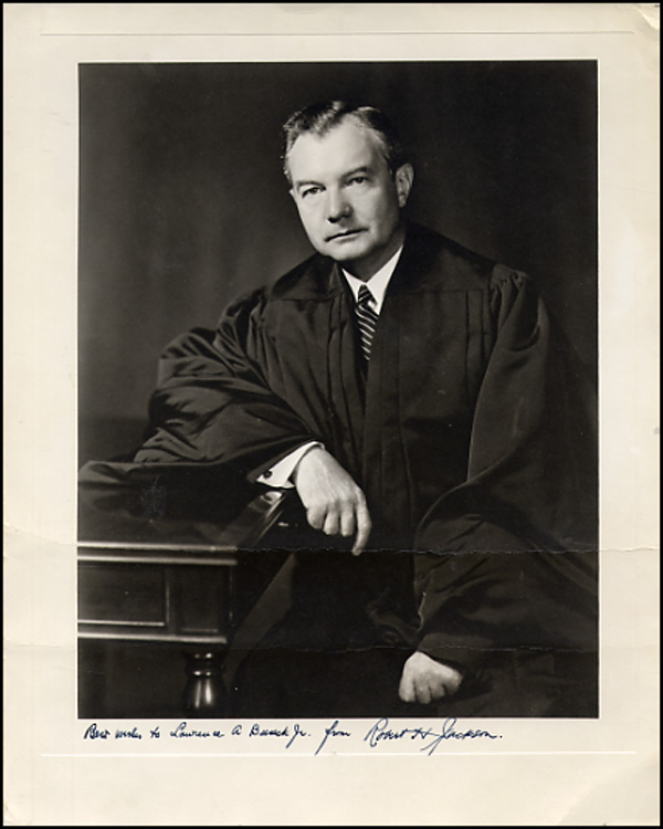 US Attorney General and Chief US prosecutor at the Nuremberg war crimes tribunal. Vintage matte-finish 9 x 12 photo of Jackson in his robe, signed and inscribed in fountain pen 'Best wishes to Lawrence A. Buseck, Jr. from Robert H. Jackson.' In very good condition, with two noticeable horizontal creases to image and some minor corner creasing. RRAuction COA.