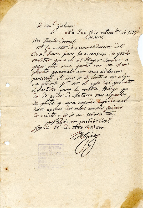 One of South America's greatest generals. His victories over the Spaniards won independence for Bolivia, Panama, Colombia, Ecuador, Peru, and Venezuela. He is called El Liberator (The Liberator) and the "George Washington of South America." ALS in Spanish, signed 'Bolivar,' one page, 8 x 11.5, September 18, 1825. Letter of recommendation to Col. Galvan. In part, 'Regarding the promotion in military rank for Major Jordan I add my own, along with my personal approval and support, which I believe will be held in some esteem because it is offered by the Commander of the Liberation Army. I beg you, if you can, to as [Nestures] for my silver spurs and a sword that I left with him just two months ago.' Some light toning, heavier to two corners, expected folds, punch holes to left side, small area of paper loss to right side and an office stamp near signature, otherwise fine condition. COA John Reznikoff/University Archives and RRAuction COA.