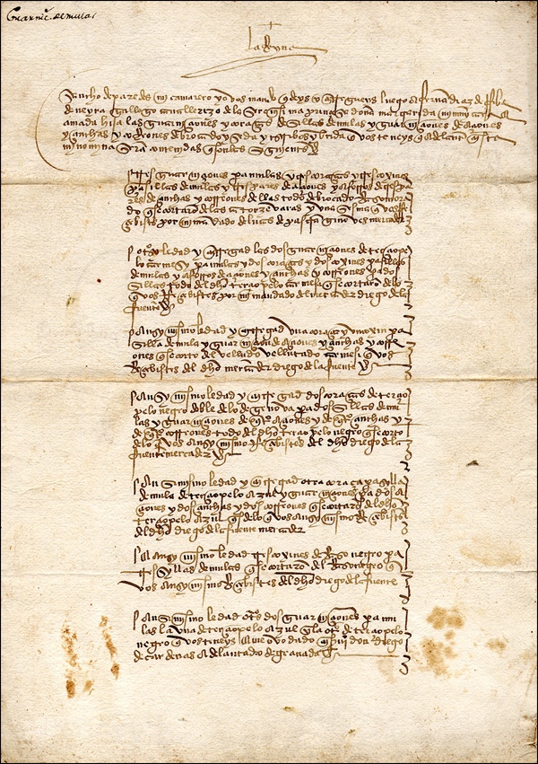 Monarch who financed the expedition of Christopher Columbus in 1492, helping to discover a new world. DS, signed 'Yo la Reyna,' one page both sides, 8.5 x 12.5, December 10, 1499. Untranslated Spanish document, ordering her chamberlain, Sancho de Paredes, to supply Fernando Diaz de Ribadeneyra, horsemaster to her daughter, Princess Margaret, with a wide array of saddles, harnesses, girths, cushions and silk straps for the princess's mules. Counter signed by Gaspar de Trizio. In fine condition, with scattered light spotting and soiling, not affecting text or signatures. COA John Reznikoff/University Archives and RRAuction COA.