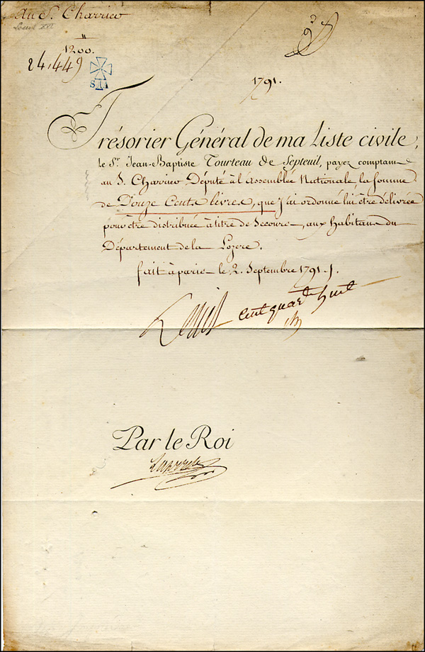 Third son of Dauphin Louis, husband of Marie Antoinette, deposed in September of 1792, tried for treason December 1792, found guilty and condemned to death, guillotined. DS, signed 'Louis,' one page, 9 x 14, September 2, 1791. Document, in French, a payment order for the State Treasury to pay a member of the National Assembly the sum of two hundred livres. In very good condition, with bisecting horizontal fold through lower portion of signature, light soiling and wrinkling, mostly to top and a few small holes. COA John Reznikoff/University Archives and RRAuction COA.
