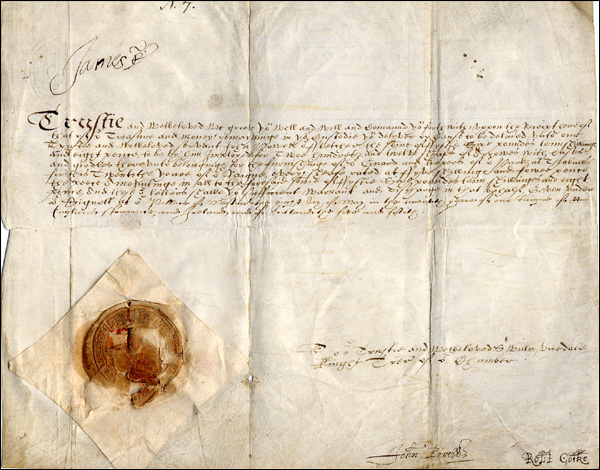 First Stuart King of England (1603-25), also King of Scots (1567-1625). On his mother's forced abdication, he was proclaimed king, and brought up by several regents. When he began to govern for himself, he ruled through his favorites, which caused a rebellion and a period of imprisonment. On Elizabeth's death, he ascended the English throne as great-grandson of James IV's English wife, Margaret Tudor. At first well received, his favoritism again brought him unpopularity. DS, signed 'James R.,' one page, 11 x 9, May 8, 1622. Document instructing the Treasurer to pay fifty five pounds to John Prorate. In very good condition, with a fold through small portion of first letter of signature, scattered light toning and creasing, several small holes, and a worn partial seal. COA John Reznikoff/University Archives and RRAuction COA.