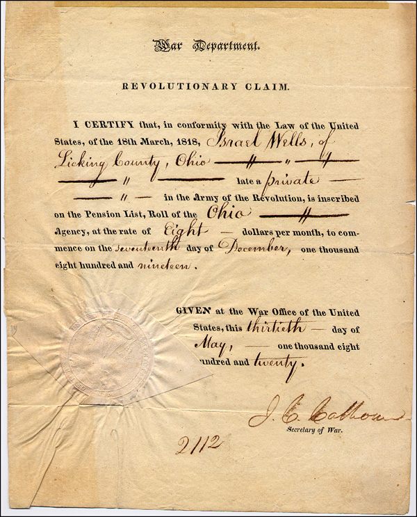 DS, signed 'J. C. Calhoun,' one page, 8 x 10, War Department letterhead, May 30, 1820. Calhoun, as Secretary of War, signs a revolutionary claim, granting Israel Wells, 'a Private in the Army of the Revolution,' a pension 'at the rate of eight dollars per month.' In very good condition, with light brushing to signature, horizontal fold through signature, some light soiling and intact seal. RRAuction COA.