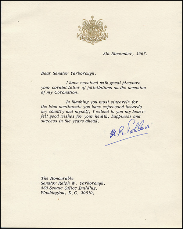 Deposed Shah of Iran. TLS signed 'M. R. Pahlavi,' one page, 7.25 x 9, embossed Royal letterhead, November 8, 1967. Letter to Senator Ralph Yarborough. In part, 'I have received with great pleasure your cordial letter of felicitations on the occasion of my Coronation.' Accompanied by a letter of transmission, dated November 20, 1967, from the Iranian Ambassador, acknowledging the letter. In fine condition. Accompanied by the original envelopes. RRAuction COA.