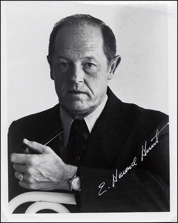 Achieved notoriety as a Watergate "Plumber", but his career stretches back to the 50s, when he helped overthrow Guatemala's democratically elected government A psych-op and propaganda specialist, Hunt was also liaison to the anti-Castro terror groups. Glossy 8 x 10 photo, signed in white ink. In fine condition, with crease to top right corner. RRAuction COA.
