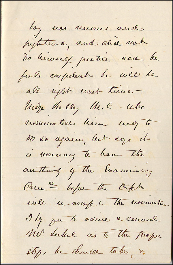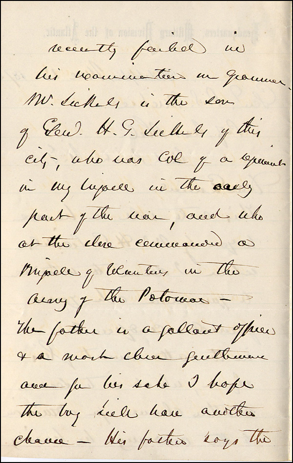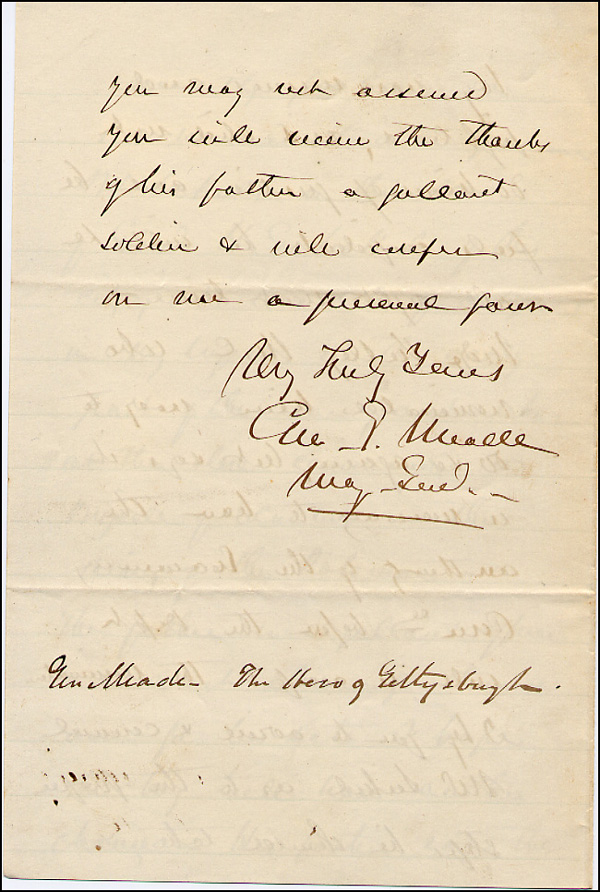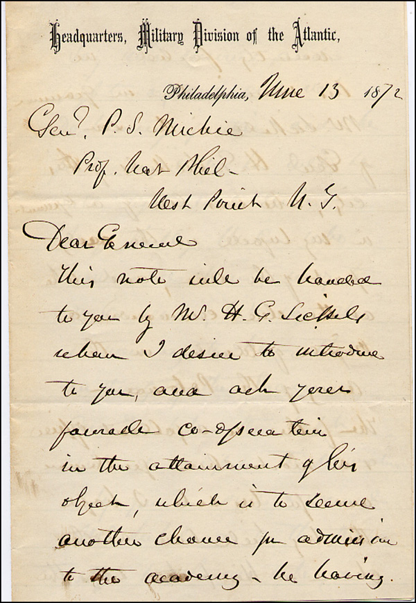 Union general who commanded brilliantly at Gettysburg, leading to a Union victory and the turning point of the Civil War. ALS signed 'Geo. C. Meade, Maj. Genl.,' four pages on two adjoining sheets, 5.25 x 8, Headquarters, Military Division of the Atlantic letterhead, June 13, 1872. Letter to his old army buddy, P. S. Michie. In part, 'This note will be handed to you by Mr. H. Sickels, whom I desire to introduce to you, and ask for your favorable co-operation in the attainment of his object, which is to secure another chance for admission to the academy, he having recently failed his examination in grammar. Mr. Sickles is the son of Genl. H. G. Sickels of this city, who was Col. of a regiment in my brigade in the early part of the war, and who at the close commanded a Brigade of Volunteers in the Army of the Potomacc. The father is a gallant officer and a most dear gentleman and for his sake I hope the boy will have another chance.' In fine condition. Gates was admitted to the Academy three months later and eventually transferred to the 7th Cavalry, one month after Custer's massacre. RRAuction COA.