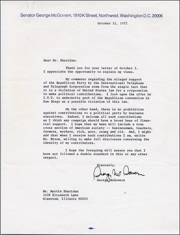 TLS, one page, 8 x 10.5, Senator George McGovern letterhead, October 11, 1972. Letter as a presidential candidate. In part, 'I look upon the offer by I. T. T. to underwrite part of the Republican convention in San Diego as a possible violation of law...there is no prohibition against contributions to a political party by business executives...when I receive such contributions I am, unlike Mr. Nixon, willing to make a full disclosure.' In fine condition. RRAuction COA.