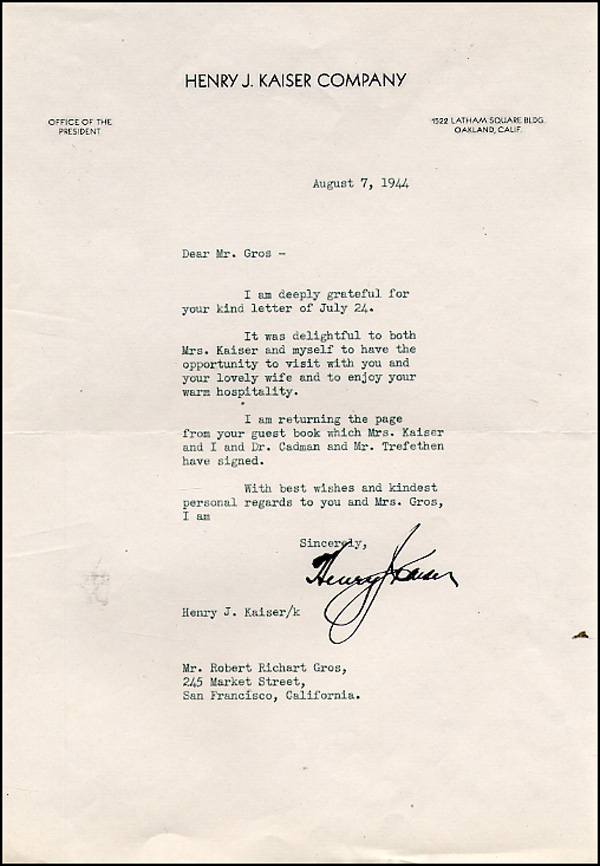 American industrialist and entrepreneur influential in building the San Francisco Bridge, the Bonneville dam and the Liberty cargo ships. He later became involved in steel, aluminum and especially automobiles. TLS, one page, 7.25 x 10.5, personal letterhead, August 7, 1944. Letter of thanks regarding a recent visit. In part, 'It was delightful to both Mrs. Kaiser and myself to have the opportunity to visit with you and your lovely wife and to enjoy your warm hospitality.' In fine condition. RRAuction COA.