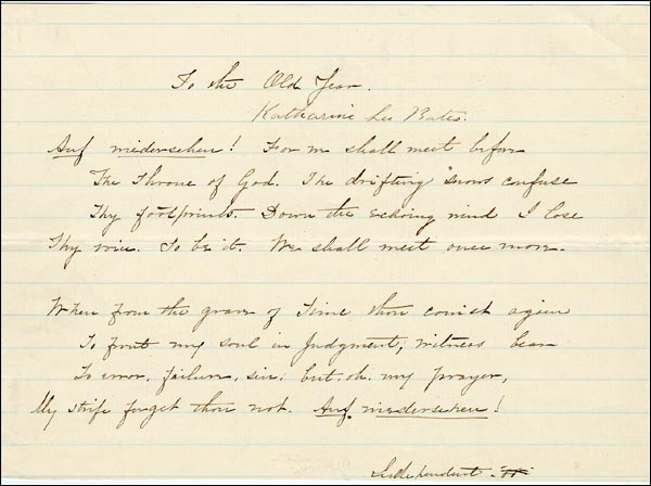 Educator and poet who wrote America the Beautiful. Handwritten poem, one lined page, 8 x 6. At the top of the page, she writes the title 'To The Old Year,' signing underneath. She then pens two four line stanzas of the poem. In part, 'For we shall meet before, The Throne of God. The drifting snows confuse, thy footprints. Down the echoing wind I lose, thy voice. So be it. We shall meet one more.' In fine condition, with a bisecting horizontal fold. COA John Reznikoff/PSA/DNA and RRAuction COA.