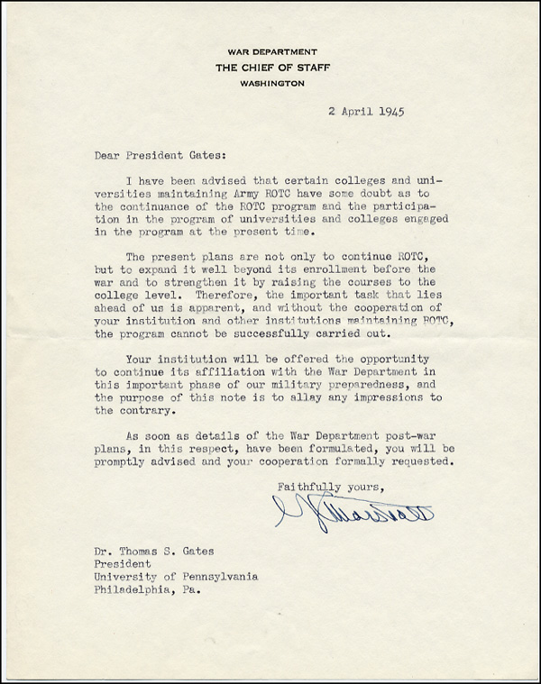 TLS signed 'G. C. Marshall,' one page, 7 x 9, War Department, Chief of Staff letterhead, April 2, 1945. Letter to the president of the University of Pennsylvania. in part, 'The present plans are not only to continue ROTC, but to expand it well beyond its enrollment before the war and to strengthen it by raising the courses to the college level...Your institution will be offered the opportunity to continue its affiliation with the War Department.' In fine condition. RRAuction COA.