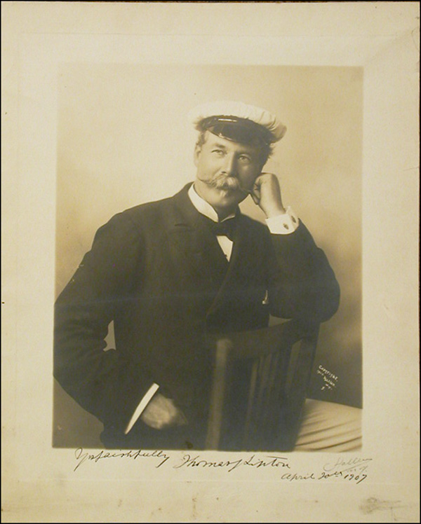 Scottish grocery magnate who revolutionized the British Empire's most popular beverage with his invention of the tea bag. Uncommon vintage matte-finish 13.5 x 17 photo of Lipton sitting backwards in a chair, signed in fountain pen, 'Yours faithfully, Thomas J. Lipton, April 20, 1907.' In fine condition, with some light surface marks to image, a few tack holes, edge dings and soiling to borders and a couple traces of light silvering. RRAuction COA.