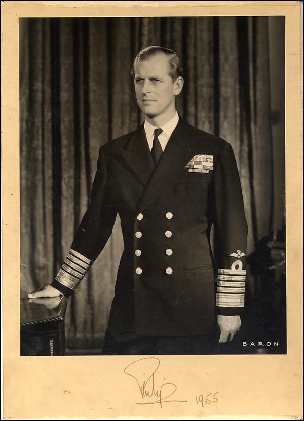 Vintage matte-finish 8.75 x 12 photo of Philip in full dress uniform, signed on the mount in fountain pen, 'Philip 1955.' In fine condition, with light overall toning to mount and some minor surface loss to top and bottom edges from mounting remnants. RRAuction COA.